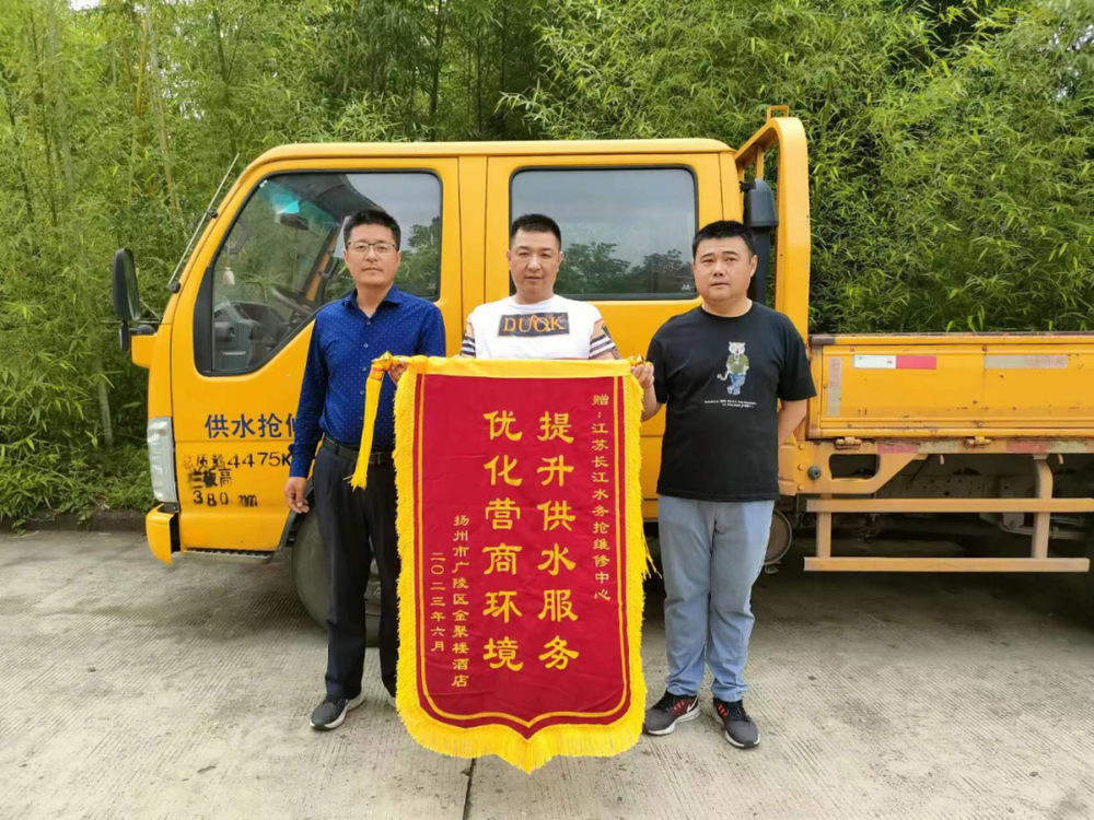 “真的非常感謝你們,為民解憂,徹底解決了我們酒店用水的問題!”近日,揚州金聚德酒店負責人親自來到立新路,將一面印有“提升供水服務 優化營商環境”的錦旗送到了長江水務搶維修中心,感謝水網先鋒搶修隊員為該酒店解決了水壓問題。