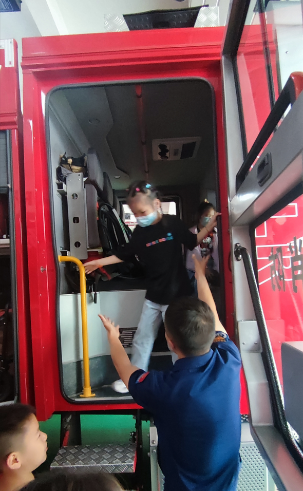 在實操體驗中,消防人員現場邀請小朋友們零距離接觸消防裝備、親身試穿防護服、乘坐消防車、參觀消防救援隊員的日常生活。