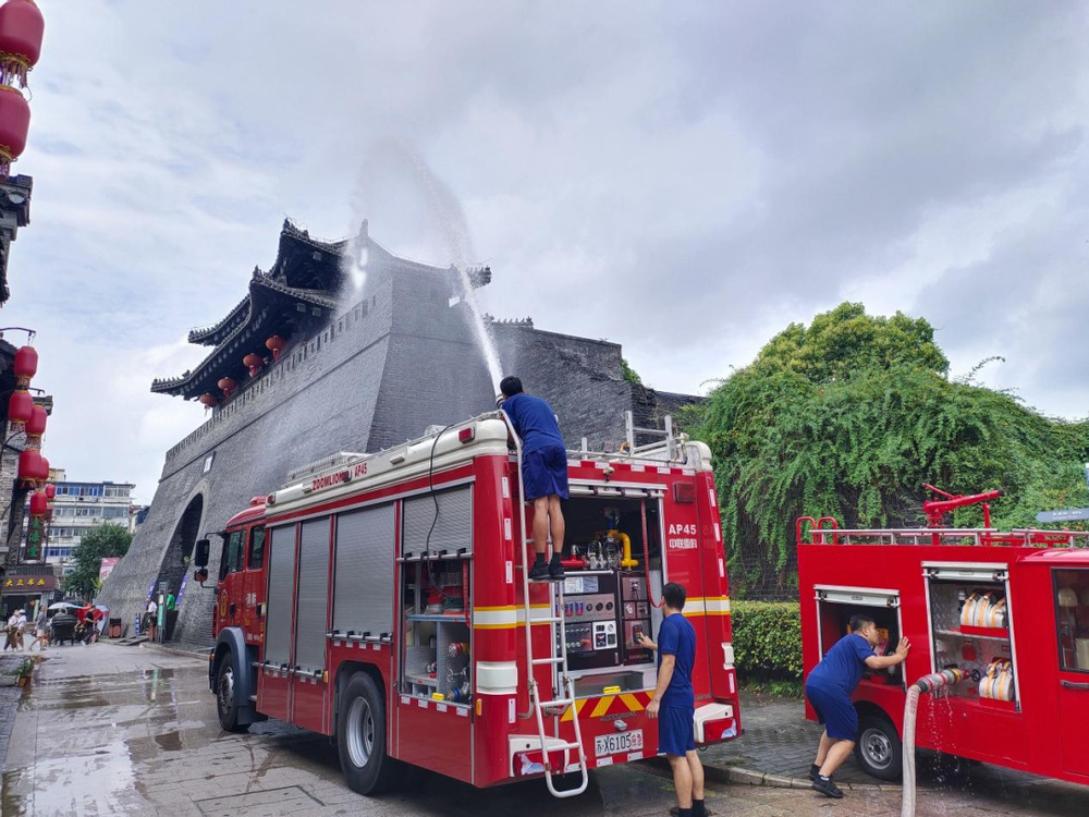 此次演習從實戰的角度出發,測算水帶干線的鋪設距離、水槍陣地設置、力量部署、車輛的位置停靠等信息。演練前,消防員與安保人員再次逐一對消防通道、室外消火栓布局、水源分布、電源位置等情況查看。隨后,消防員模擬街區最高點城門樓重檐頂部起火,根據前期制定的滅火救援方案從多角度、多位置對“著火點”進行滅火救援。