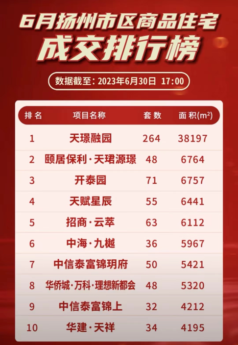 天璟融園項目自2023年6月2日首開入市銷售以來,一直備受揚州房產市場關注,不僅成為2023年揚州樓市第一個搖號樓盤,當月更是以成交備案264套的成績榮登揚州市區商品住宅成交排行榜首位(數據來源自揚州房地產信息網項目備案數據)。
