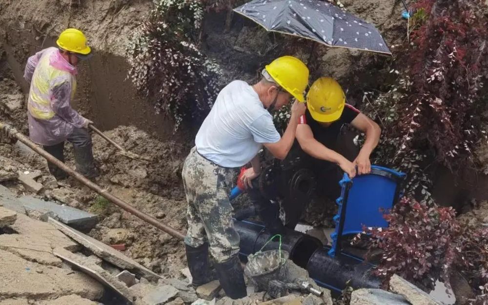 持續(xù)暴雨容易造成地下供水管道的損壞,因此長(zhǎng)江水務(wù)增強(qiáng)管網(wǎng)搶修應(yīng)急處置力量,配置應(yīng)急搶修車、送水車、發(fā)電車,提前儲(chǔ)備水泵、發(fā)電機(jī)、電焊機(jī)、挖掘機(jī)、裝載機(jī)等應(yīng)急搶修裝備,確保搶修快速反應(yīng)。7月7日下午2點(diǎn)多,受強(qiáng)降雨影響,邗江萬(wàn)達(dá)南側(cè)地基松塌造成供水管道破裂,水柱高達(dá)數(shù)米。長(zhǎng)江水務(wù)搶修隊(duì)冒雨搶修,及時(shí)修復(fù)管道,未對(duì)周圍居民造成較大影響。