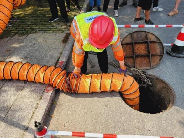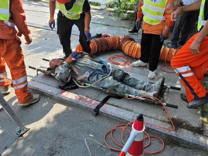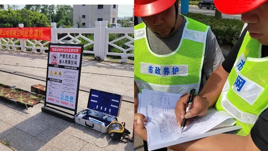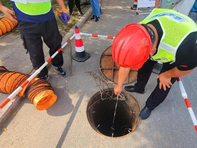 演練模擬了施工人員在污水井內維修工作過程中突發頭暈不適,事故發生后,現場施工負責人匯報項目負責人,并立即啟動《有限空間作業事故應急預案》。