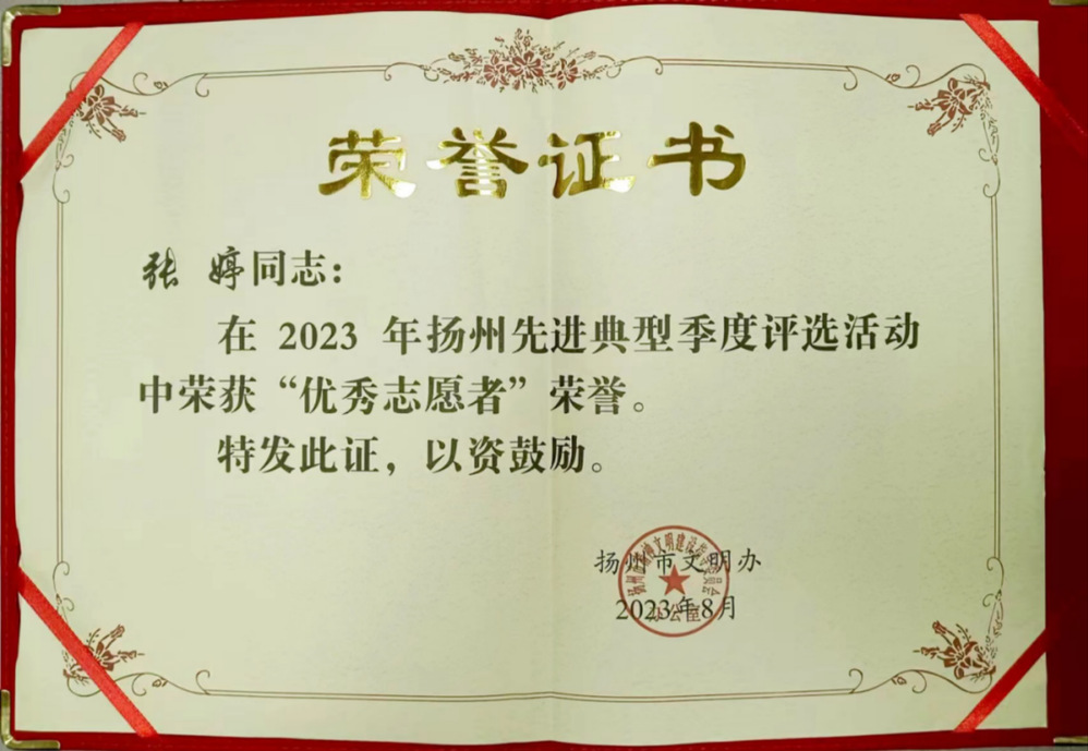 近日,由揚州市文明辦傳來喜訊,潔源環境公司“源動力”志愿者服務隊環保講師張婷榮獲揚州市“優秀志愿者”稱號。
