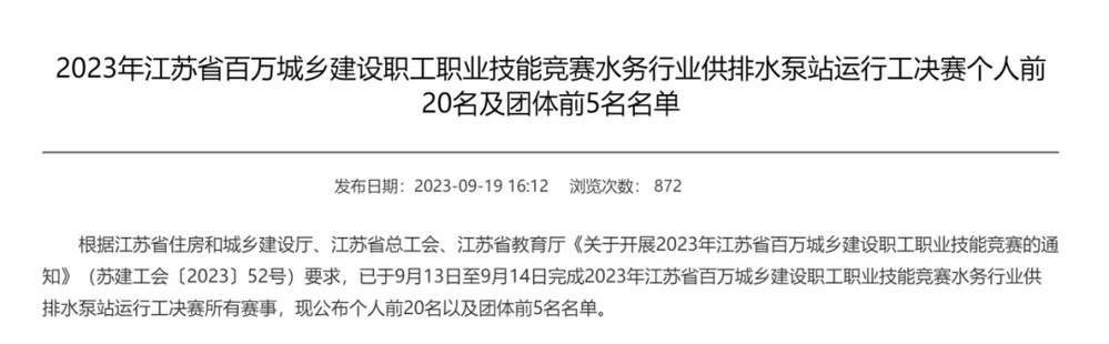 近日,江蘇省住房和城鄉(xiāng)建設(shè)廳公布了“2023年江蘇省百萬城鄉(xiāng)建設(shè)職工職業(yè)技能競賽水務(wù)行業(yè)供排水泵站運行工決賽”個人前20名及團(tuán)體前5名名單。長江水務(wù)選手在全省近百名參賽選手的激烈角逐中表現(xiàn)出色、取得佳績,丁杰、龔委、譚寶龍位列個人成績前20名,均榮獲“優(yōu)秀選手”稱號,其他選手也正常發(fā)揮取得較好排名,揚州代表隊榮獲團(tuán)體總分第5名。