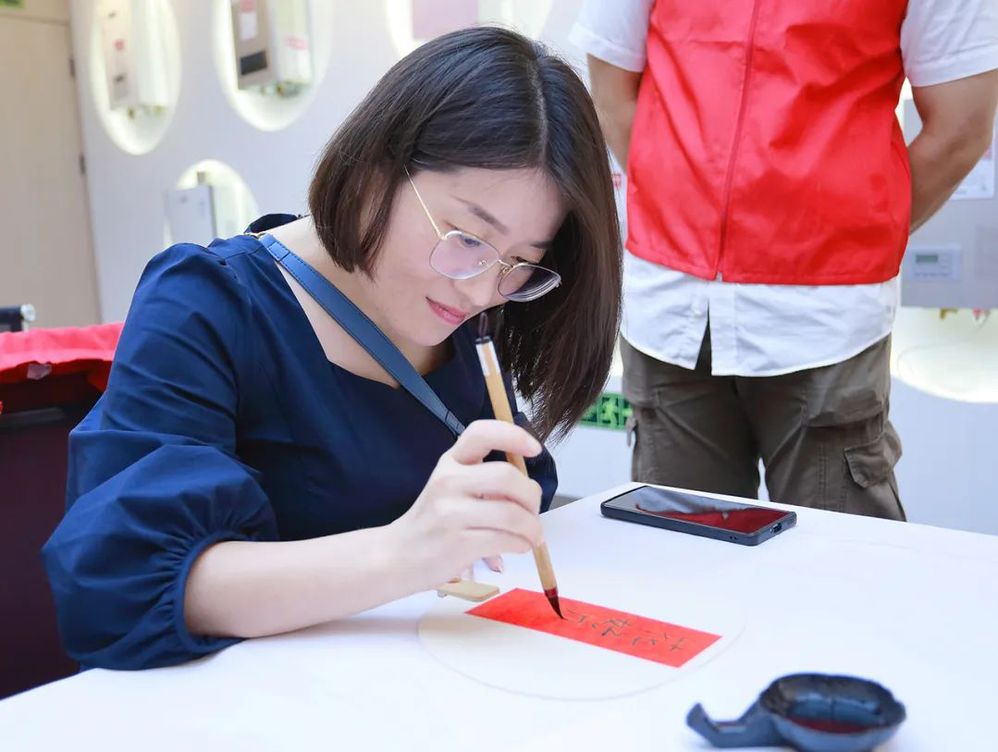 團扇寓意著團團圓圓、家庭美滿、闔家歡樂。貼上萬年紅方宣,飽蘸一得閣墨汁,中秋安康,平安喜樂,氣聚人和、但愿人長久、千里共嬋娟……一幅幅墨寶被志愿者賦予了濃情和溫度,一張張笑臉隨筆墨齊飛揚。前來辦理業務的戚女士也是書法愛好者,與志愿者們交流切磋,現場即興書寫了一把小楷“花好月圓”團扇,開心地說:感謝揚州中燃提供的互動平臺,過了一把癮;印刷的書畫團扇花錢隨處都能買到,但我還是喜歡手寫的,有溫度、接地氣,每一幅都是獨一無二的,福氣滿滿、韻味濃濃。