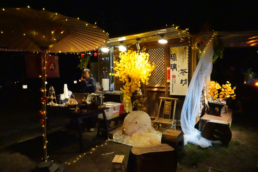 集市區(qū)域遵循書中內(nèi)容,攤位設(shè)計(jì)風(fēng)格趨于宋時(shí)風(fēng)貌,參與集市的商家皆著宋代服飾。攤位種類多樣,形式豐富,有飲子、茶點(diǎn)、香道、茶道、花藝、糖藝、玩具、非遺技藝及投壺等互動型古代娛樂活動。