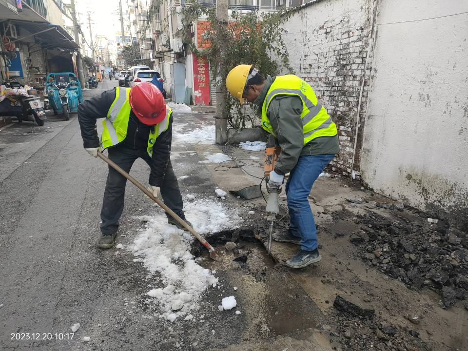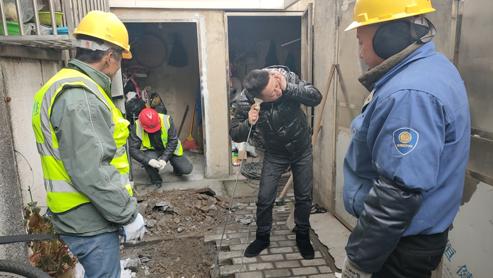 接到報修電話后,長江水務搶維修中心搶修人員立即趕到現場,細致查勘確定是表前PE63管道凍裂漏水造成水壓變小。嚴寒天氣下,地面凍得很硬,為方便搶修施工,搶維修中心又調來挖掘機開挖基坑,搶修人員冒著零度以下的嚴寒關閉閘門、停水搶修。在修復凍裂的管道后,供水搶修負責人到王大姐家打開水龍頭,檢查水壓是否正常,在獲得王大姐的滿意答復后才離開現場。在搶修尾聲,供水搶修人員又接到馬太巷居民報修處理的工單,搶修人員稍作休息又趕赴下一站。