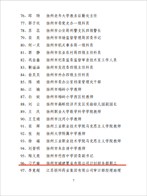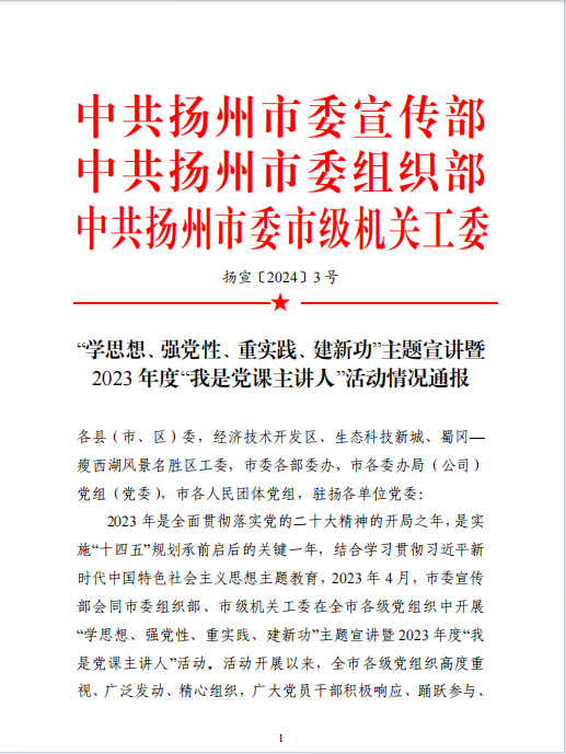 近日,市委宣傳部、市委組織部、市級機關(guān)工委下發(fā)了《“學(xué)思想、強黨性、重實踐、建新功”主題宣講暨2023年度“我是黨課主講人”活動情況通報》,城控集團(tuán)選送的2名選手——揚州市城建置業(yè)有限公司刁藝璇、江蘇長江水務(wù)股份有限公司張薇被評為2023年度揚州市“優(yōu)秀黨課主講人”。
