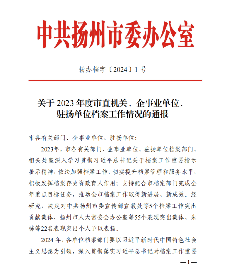 新年伊始,城控集團檔案工作迎來開門紅!揚州市委辦公室發(fā)文《關于2023年度市直機關、企事業(yè)單位、駐揚單位檔案工作情況的通報》,城控集團獲評“2023年度檔案工作表現(xiàn)突出集體”。