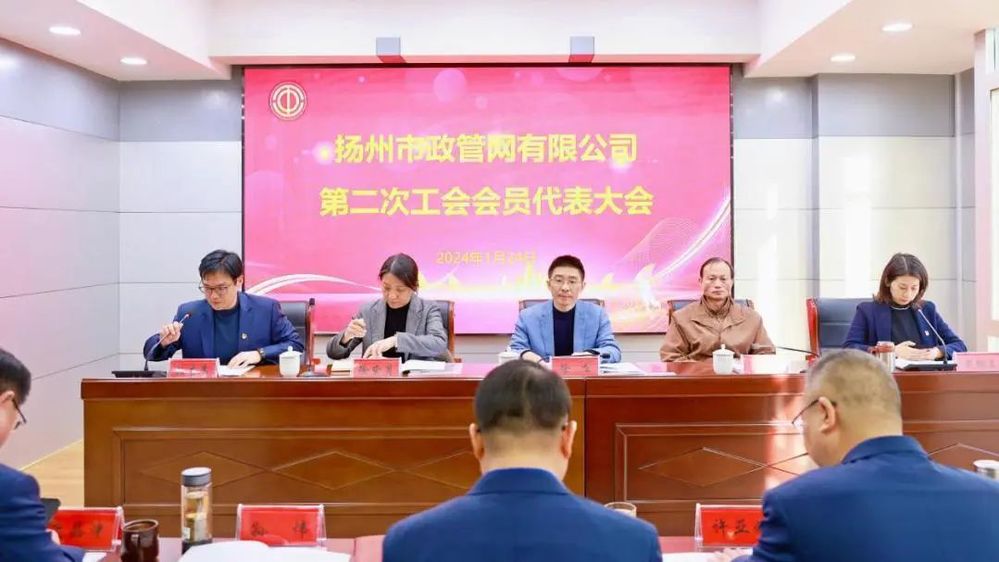1月24日下午,揚(yáng)州市政管網(wǎng)有限公司第二次工會會員代表大會順利召開。集團(tuán)黨委副書記徐飛、市總工會建設(shè)工會主任范華、集團(tuán)直屬聯(lián)合基層工會主席徐紫月應(yīng)邀參會,公司工會會員代表參加會議。