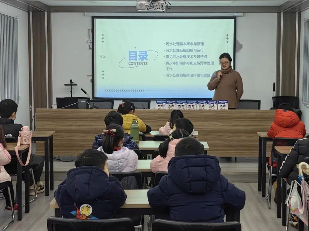 在多功能廳,環保講師以污水處理及保護為主題,通過一幅幅生動的圖片和通俗易懂的語言,為40余名小朋友上了一堂以污水處理與再生水利用為主題的科普教育課,并向小朋友們講述了節水用水、水環境保護的重要意義。在交流互動環節,小朋友們分享了各自環保小故事和節約用水小妙招,環保講師也一一回答了小朋友們提出的問題。