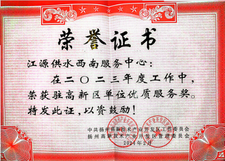 過去一年,長江水務江源公司在優化營商環境、提升對外服務質量方面取得了顯著工作成效,杭集、方巷、槐泗、楊廟、汊河、甘泉等6家網點于近日分別榮獲優質服務單位榮譽稱號。
