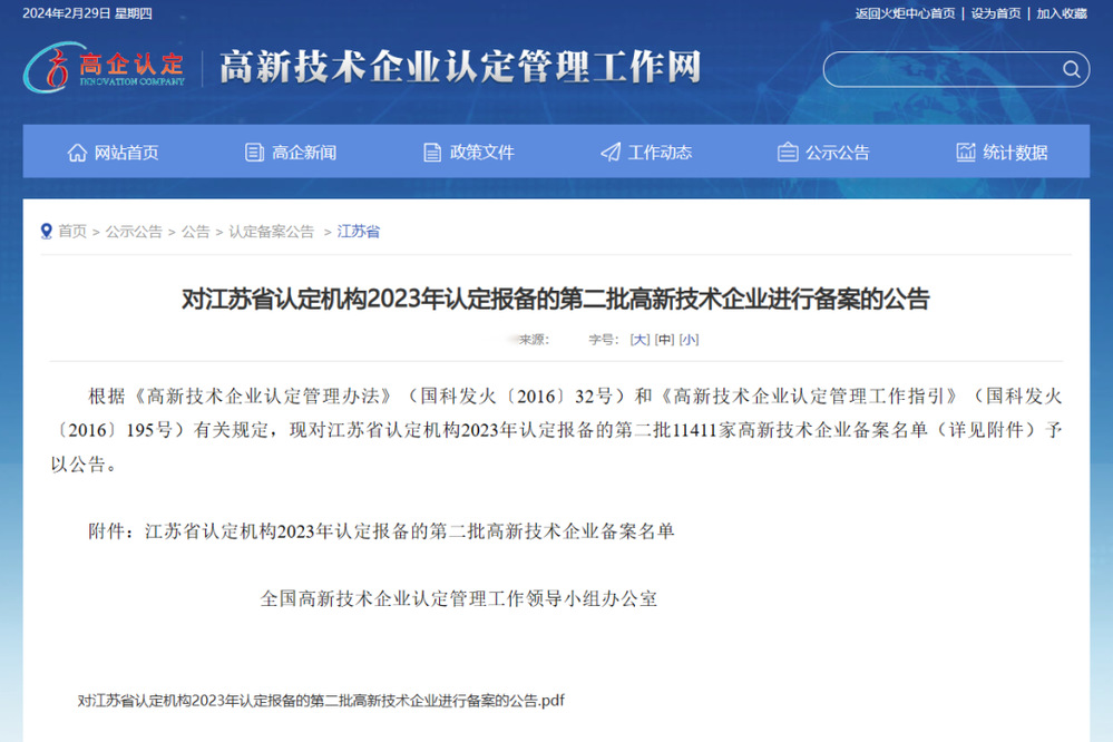 近日,全國高新技術企業認定管理工作領導小組辦公室發布了《對江蘇省認定機構2023年認定報備的第二批高新技術企業進行備案的公告》,管網公司下屬揚州城控排水管網運維有限公司成功通過認定,并榮獲“國家高新技術企業”。