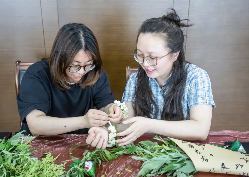 活動現場,專業老師細致講解了艾草葉花、茉莉花手串的操作流程和關鍵步驟等。隨即,大家化身為手工達人,按照老師的步驟和方法,一邊學習制作一邊交流經驗,將新鮮的艾草、菖蒲、茉莉花材料,加工成一束束造型別致的艾草花束、一串串潔白清香的茉莉手串,濃濃的端午氣息撲面,大家在歡聲笑語中享受著儀式感滿滿的DIY樂趣。