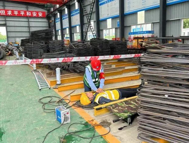 此次演練分為基坑坍塌視頻培訓、高溫中暑桌面演練、觸電救援實操演練三個環節進行。其中,實操演練模擬拖地電線造成一名鋼筋工觸電。現場指揮、警戒疏散、醫療救護、事故調查、通訊聯絡等工作小組按照應急救援方案快速響應,依次有序開展救援工作。