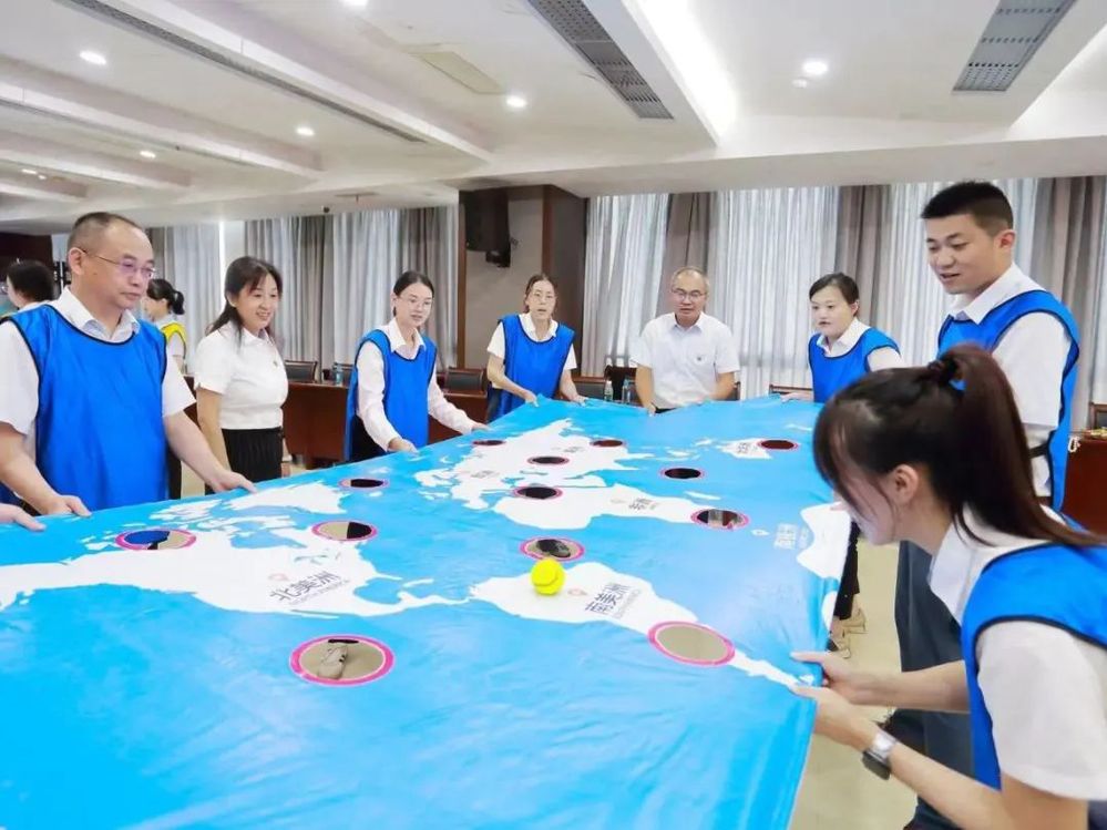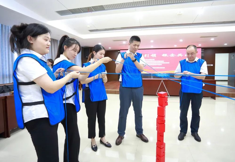 此次共建活動在歡快輕松的氛圍中進行,為充分調動大家的參與熱情,在主持人熱情地引導下,大家首先進行了熱身。熱身活動后,揚州中燃公司和三家銀行組建三支團隊依次開展“環游世界八十天”、“達芬奇密碼”、“聯合攻城”等一系列團隊協作競賽。大家在競賽互動中不斷磨合,增強了彼此之間的信任感和團隊凝聚力?!奥摵瞎コ恰弊鳛楦傎惌h節的最后一個項目,將現場的氣氛推到一個高潮。“聯合攻城”需要隊員們同時操控手中的繩子,利用三角形的鉤子,將現場的八塊積木堆積成一個柱子,堆積過程中手不可觸碰積木,且柱子不倒塌視為完成競賽,用時最少的隊伍獲勝。這項競賽既考驗了隊員們之間的團隊協作能力,又考驗了每一位隊員的心理素質和應對能力,大家在團結緊張活潑的氣氛中感受著充滿挑戰競賽過程和完成項目的喜悅。