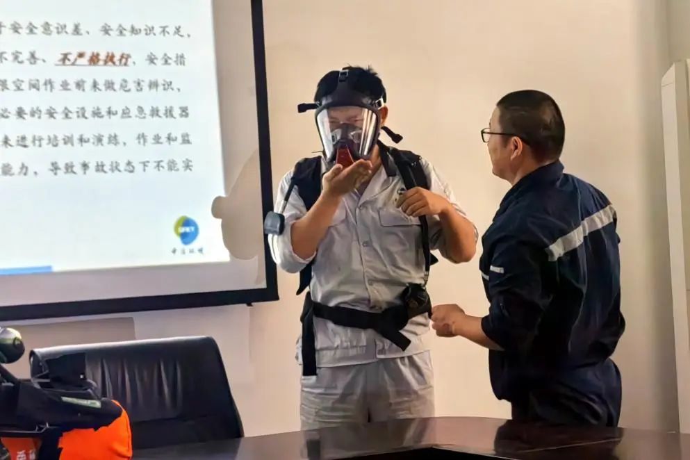 除了理論知識的講解,培訓還增加了安全防護設施的穿戴實操環節,員工們親身體驗了正壓式空氣呼吸器的穿戴和使用。通過實操學習,員工們不僅掌握了正確的穿戴方法,還深刻體會到了安全防護設施在保障人身安全方面的重要作用。