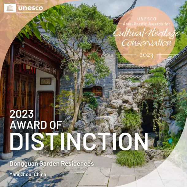 亞太文化遺產保護獎是由聯合國教科文組織發起的區域性獎項,旨在表彰亞太地區個人及公私部門在保護或恢復區域具有遺產價值的建筑、場所和不動產方面取得的成就,以鼓勵個人參與及公私合作,保護本地區的文化遺產,造福今世后代。2023年12月21日,揚州城控集團申報的“揚州東關街園宅保護與傳承復興項目”從亞太地區8個國家48個參賽項目中脫穎而出,斬獲聯合國教科文組“2023年度亞太文化遺產保護獎杰出獎”,是中國唯一獲得“杰出獎”的文保項目。聯合國教科文組織在項目評審語中寫到“東關歷史文化街區是傳統文化與當代景觀設計的完美結合,為亞太地區古典園林保護及活化利用提供了重要參考”。
