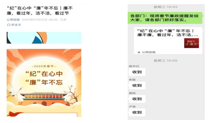 廉潔提醒在強化廉潔意識、預防腐敗行為、促進公正與公平、維護組織形象以及推動社會進步等方面都具有重要意義。公用控股公司發布節前廉潔提醒,通過公司公眾號、微信工作群等發送廉潔提醒信息,引導干部職工過節不忘紀律、不忘規矩、守住底線、勿觸紅線,共同營造一個廉潔文明、歡樂祥和的節日氛圍。下一步,公用控股公司將持續做優以上“3”個固定動作,不斷拓展廉政教育模式的內涵與外延,努力構建“3+N”廉政教育模式,強化節前廉政教育成效,確保節日期間風清氣正,為公司高質量發展提供堅強的組織保障。