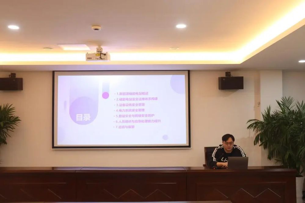 公司員工圍繞“新能源儲(chǔ)能電站運(yùn)維管理”主題,結(jié)合新能源儲(chǔ)能電站發(fā)展現(xiàn)狀及趨勢(shì),從設(shè)備設(shè)施安全管理、電力系統(tǒng)安全管理等方面,講解了新能源儲(chǔ)能電站安全運(yùn)維要點(diǎn)、電網(wǎng)接入及并網(wǎng)調(diào)度規(guī)范、遠(yuǎn)程監(jiān)控平臺(tái)安全防護(hù)等安全運(yùn)維知識(shí),為大家展現(xiàn)了一堂生動(dòng)有趣、內(nèi)容豐富的安全教育課。