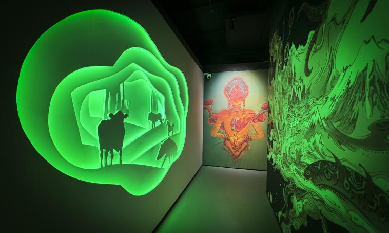 展館以《山海經(jīng)》中記載的128只奇異神獸為核心,通過數(shù)字雕塑、全息投影、交互裝置等前沿技術(shù),將古籍中的文字轉(zhuǎn)化為可感知的立體奇觀。比翼鳥展翅時(shí)羽翼流光溢彩,狍鸮(饕餮)的咆哮聲震耳欲聾,帝江的混沌之舞在光影中若隱若現(xiàn)……18個(gè)主題展廳猶如18個(gè)平行時(shí)空,其中最令人驚艷的“四季”展廳,只需佩戴特制眼鏡,便能親歷春日百花綻于指尖、冬雪紛飛沾衣欲濕的四季流轉(zhuǎn)。