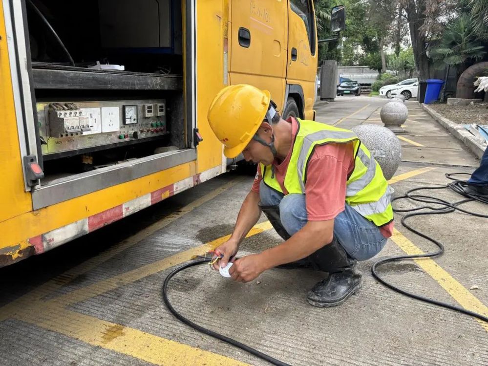 隨著監控人員發現險情并報告指揮組,演練正式啟動。應急指揮組迅速啟動防汛預案,各小組按分工火速行動:物資保障組第一時間將沙袋、排水泵等物資運送至現場,在配電房周邊構筑防水圍堰,防止積水倒灌;技術搶修組穿戴絕緣裝備,熟練操作多功能搶修車連接應急電源,啟動大功率排水泵實施快速抽排,全力保障配電設備安全;水質監測組同步開展水質檢測,確保供水水質達標。