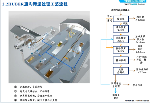 處理設(shè)備采用固體分類和固液分離技術(shù),通過洗滌轉(zhuǎn)鼓裝置與洗砂裝置的協(xié)同作業(yè),將通溝污泥中的粗大物質(zhì)、細(xì)砂及砂粒有效分離。其中,粗大物質(zhì)被輸送至垃圾處理設(shè)施,細(xì)砂得以回收再利用;濾出的污水則經(jīng)過精細(xì)過濾裝置和旋流分離一體化裝置的進(jìn)一步處理后,排放至污水處理廠。整套流程實現(xiàn)了通溝污泥的減量化、穩(wěn)定化、無害化和資源化。
