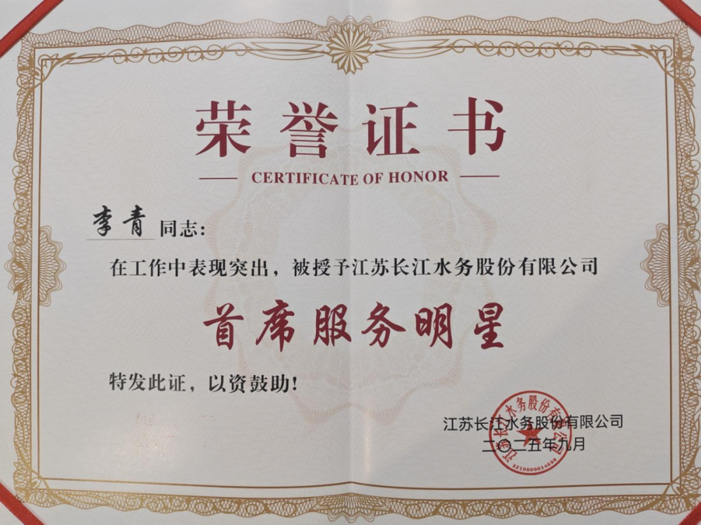如今,公司授予李青“長江水務首席服務明星”榮譽稱號,這不僅是對他三十余載在一線崗位默默耕耘、無私奉獻的充分肯定,更是對他始終堅守初心、踐行服務為民宗旨崇高精神的最高贊譽。這份榮譽不僅彰顯了李青個人的成就,更凝聚著全體水務一線員工的辛勤付出。